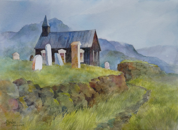 "Buthir Church Iceland" is an un-framed, watercolor on paper.